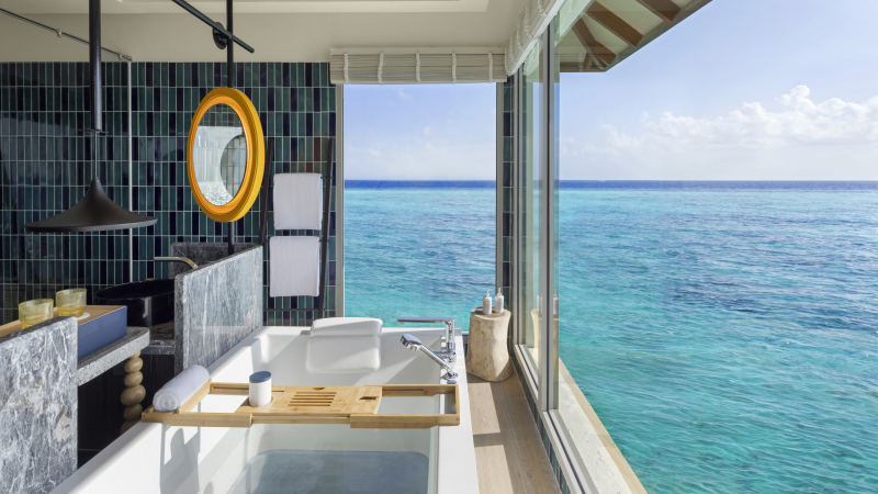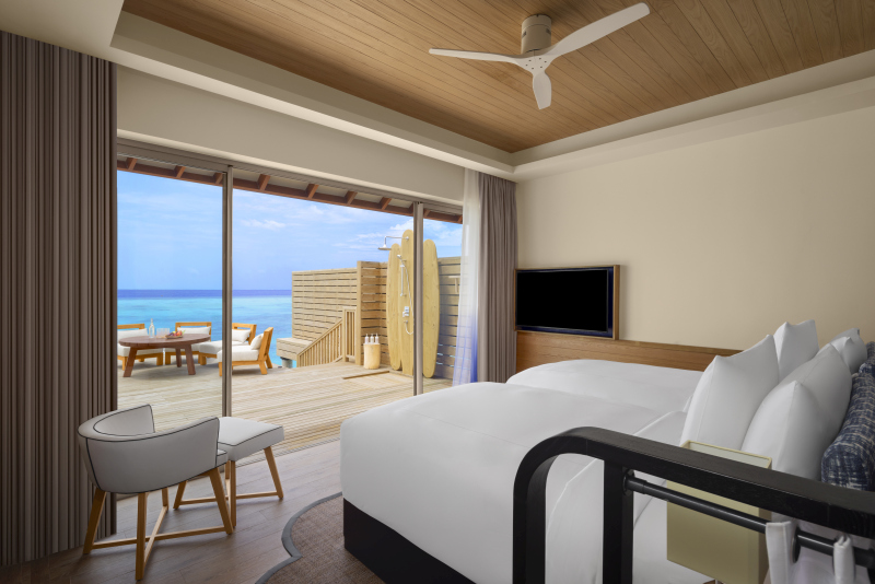 Over Water vila (87 m2) – nadvodní vila nabízí ložnici s manželskou postelí velikosti King, pohovku, polovenkovní koupelnu s vanou a sprchou. Z ložnice vstup na terasu s posezením a výhledem na oceán. Max. kapacita 2 dospělí + 1 dítě.