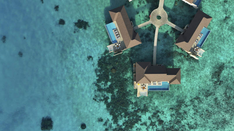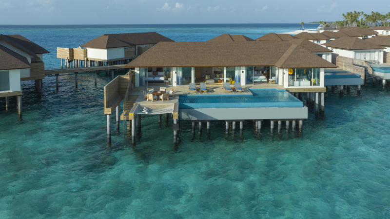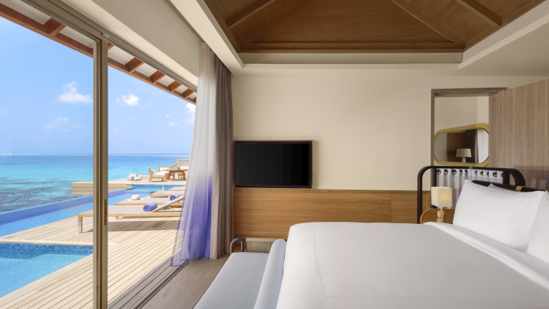 Two Bedroom Over Water Pool Residence (287 m2) – dvouložnicové nadvodní ubytování nabízí rodinám či skupince přátel navíc vnitřní kuchyň, jídelnu a obývací pokoj. Venkovní terasa a nekonečný bazén jsou dokonalým místem pro dny plné radosti. Max. kapacita 2 dospělí + 3 děti nebo 5 dospělých.