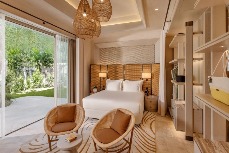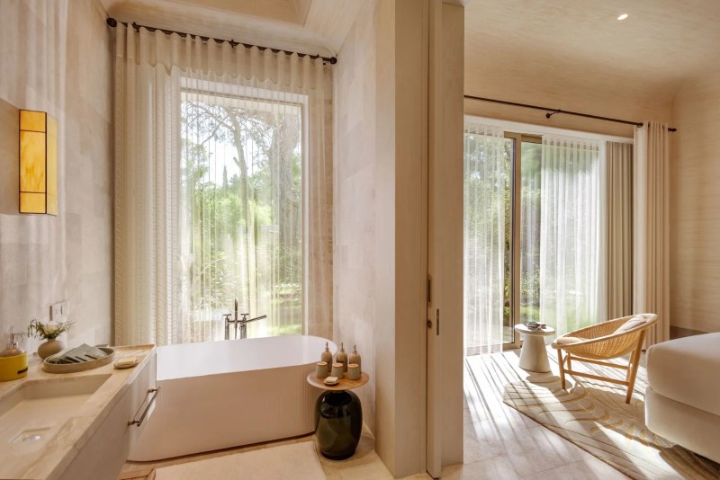 One Bedroom vila (480 m2) – vnitřní prostor vily o rozloze 70 m2 nabízí ložnici s manželskou postelí velikosti King, obývací část a koupelnu se sprchou a venkovní vanou. Z ložnice vstup na terasu s vyhřívaným bazénem a vlastní zahrádkou pro maximální soukromí. Max. kapacita 3 osoby.